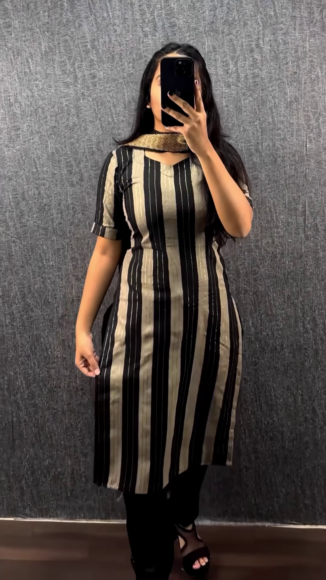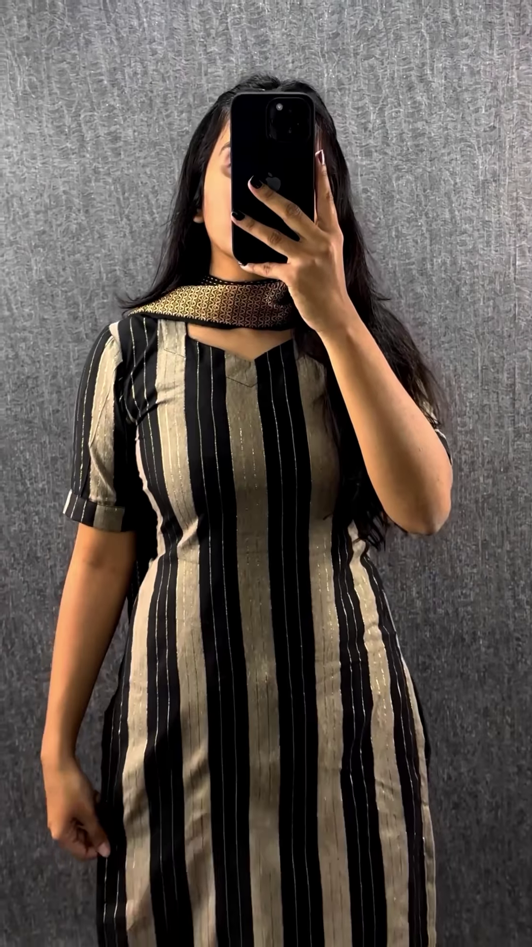 Crafted in a structured yet breathable fabric, the kurta features alternating vertical stripes in jet black and muted beige, highlighted with delicate metallic thread work that adds a hint of shimmer. These clean, vertical lines elongate the frame, making it a stylish pick for both everyday wear and office chic. The neckline is tailored in a slight sweetheart shape, adding a touch of femininity, while the short sleeves with matching stripe detailing keep the look streamlined.