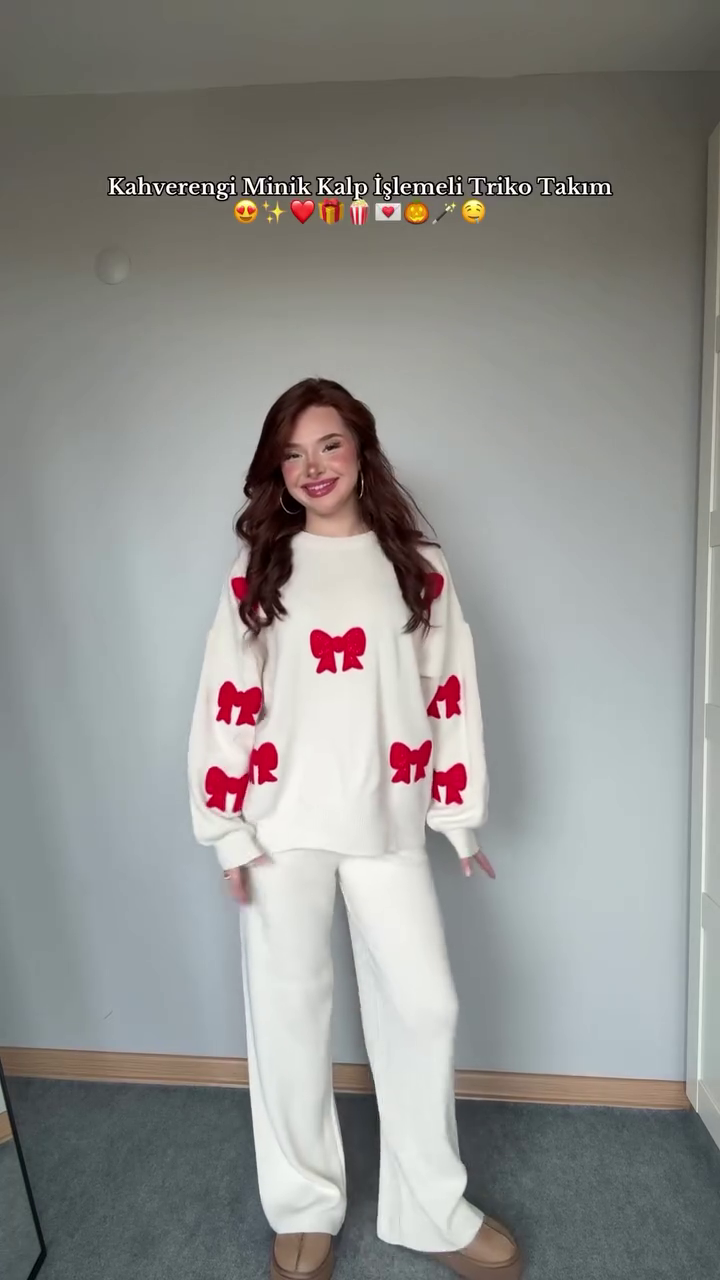- 🤍 Cream Bow Variant: Knit sweater and pants with red bow embroidery—classic and festive