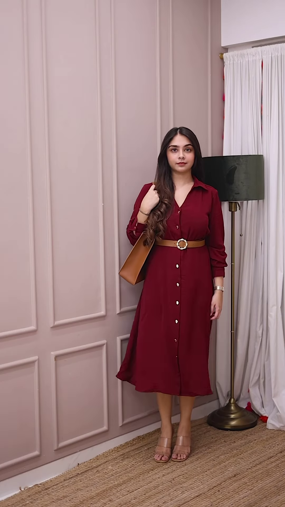 Elegant Maroon Shirt Dress with Belt – Chic & Versatile