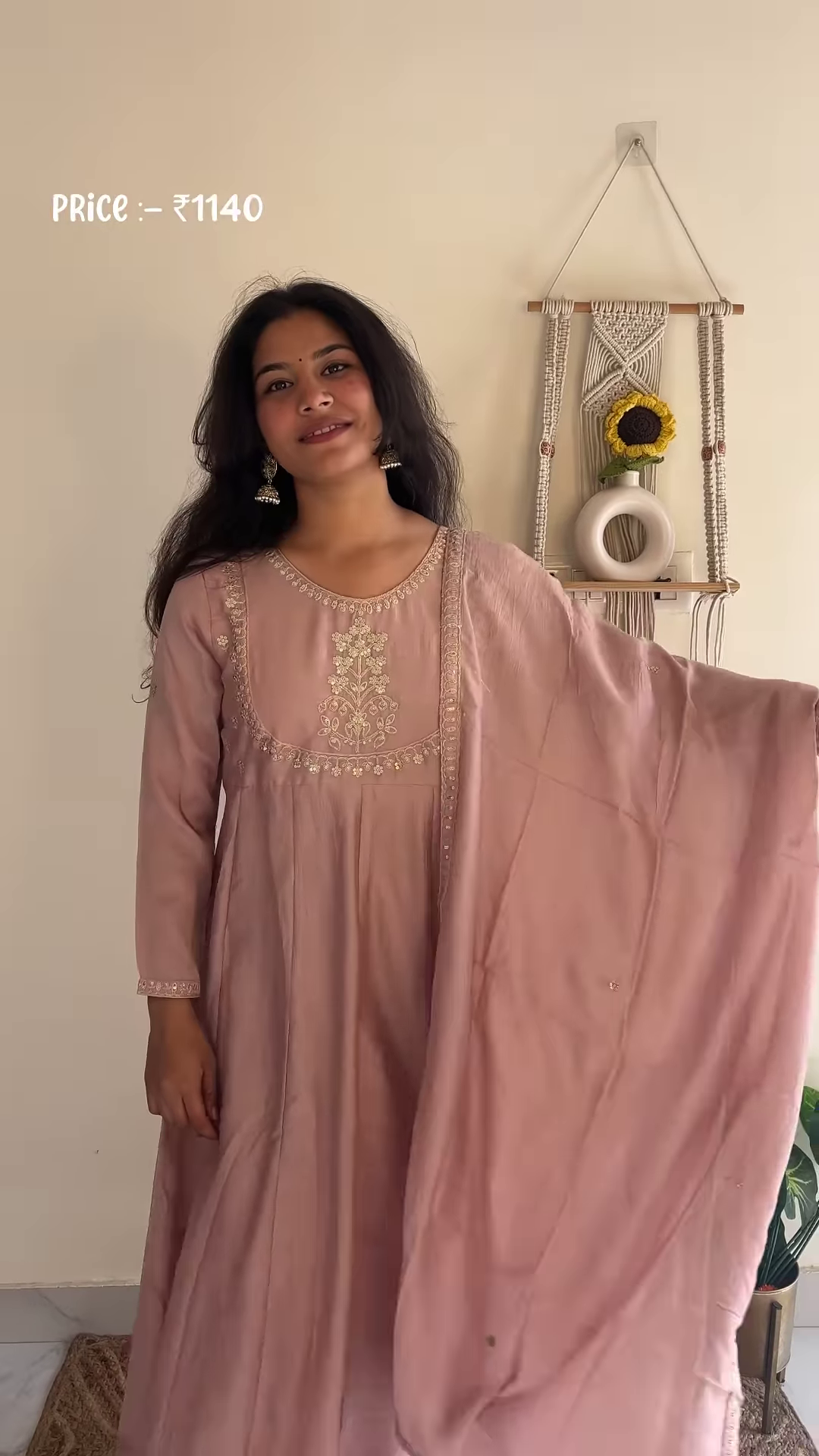 Crafted in a muted dusty rose shade, the kurta exudes a soft feminine vibe, enhanced by the lightweight dupatta that drapes effortlessly. The dupatta is finished with a matching embroidered border and subtle mirror work that glints gently under the light, adding a touch of celebratory shimmer.