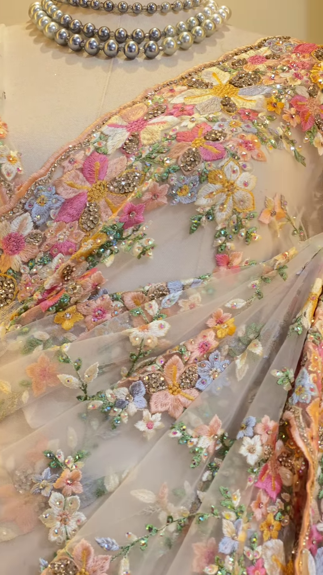 The saree boasts a luxurious soft beige or ivory base, providing a subtle yet elegant backdrop for the detailed multicolored floral embroidery. The embroidery is a stunning mix of pastel shades, including pink, lavender, peach, and yellow, with delicate green threadwork creating a lifelike foliage effect. The added beadwork and micro-sequins catch the light beautifully, giving the saree a subtle shimmer that enhances its regal appeal.