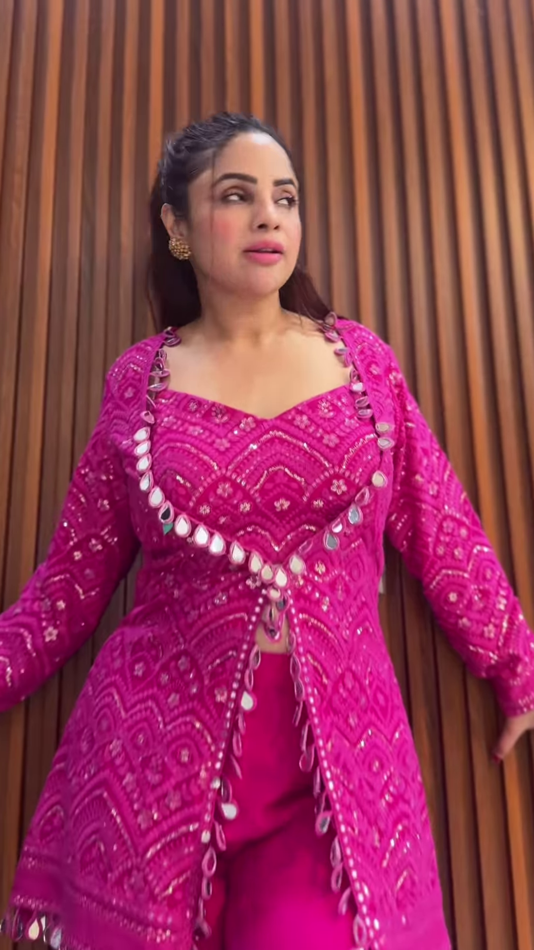 This fuchsia pink embroidered sharara set is a perfect pick for weddings, sangeet nights, Diwali parties, and festive gatherings. Style it with statement jhumkas, high heels, and a sleek ponytail or voluminous curls to accentuate the contemporary vibe. A potli bag and minimal bangles will complete your look with an elegant finish.