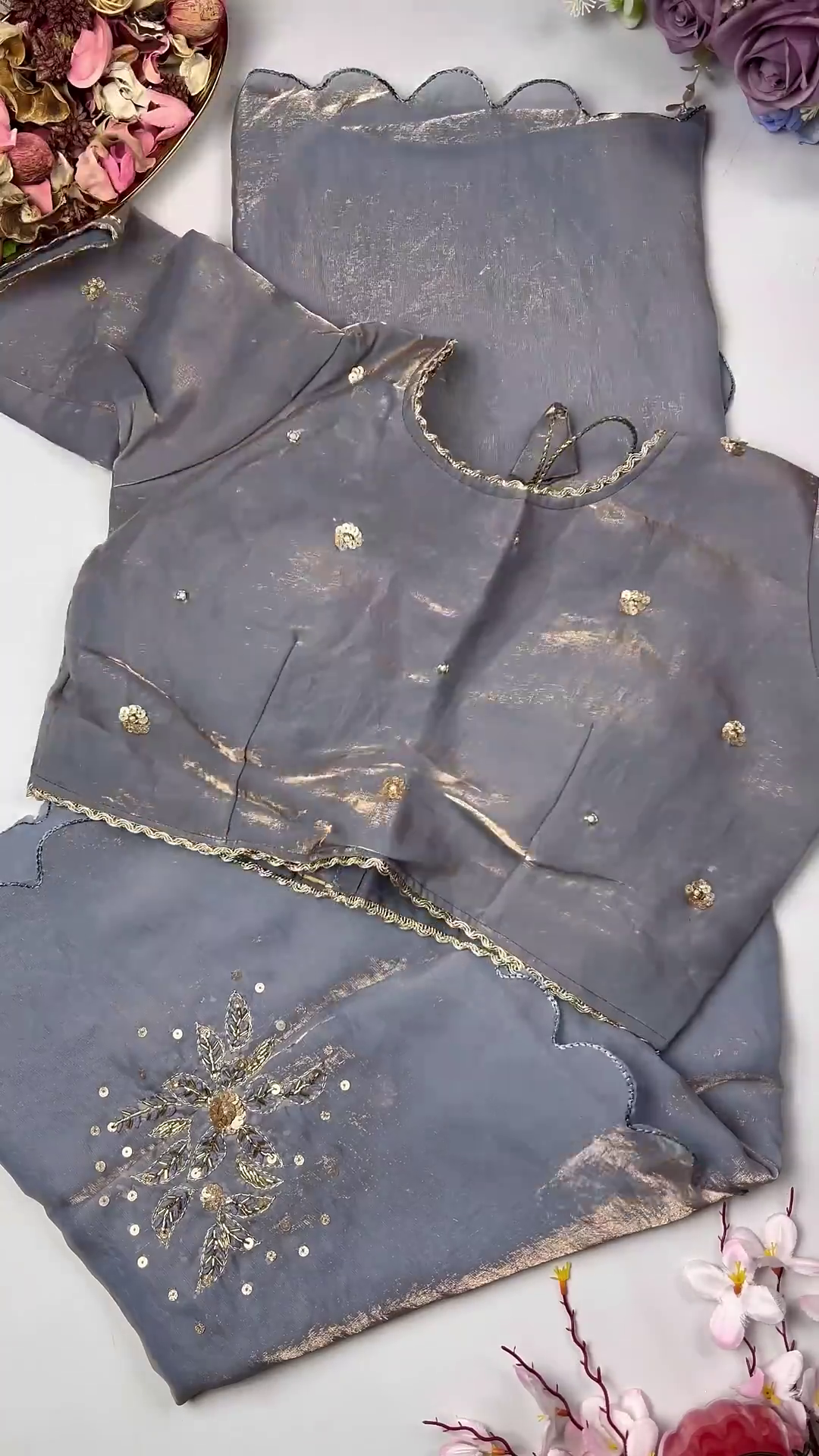 Exude ethereal charm in this sophisticated saree set, masterfully crafted from premium shimmer silk fabric that offers a luxurious metallic glow and a structured, graceful drape. The ensemble features a coordinating shimmer silk blouse with a classic round neckline, elegantly finished with a delicate golden scalloped zari border along the hem and sleeves. The bodice is accented with scattered golden sequin “buttis” and a functional dori tie-up at the back with matching fabric tassels.