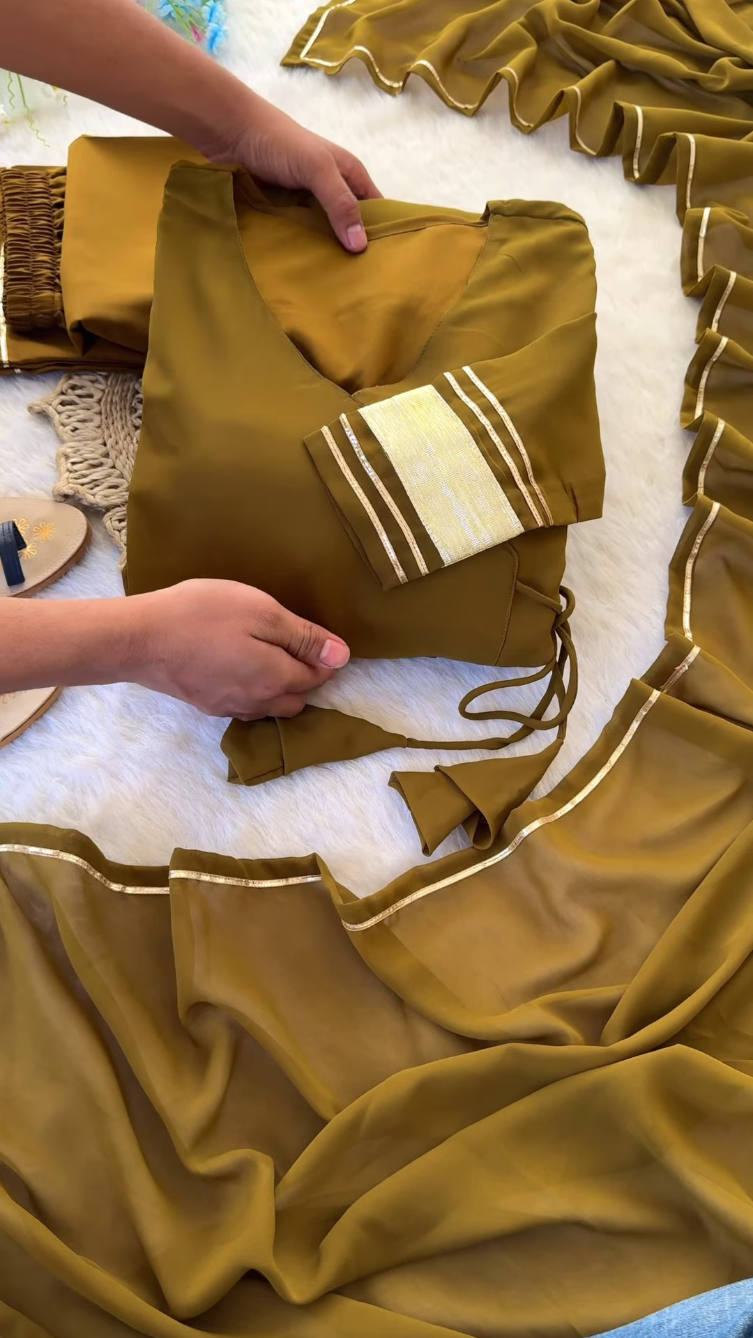 Saree: Soft georgette with ruffled layers and golden border accents
