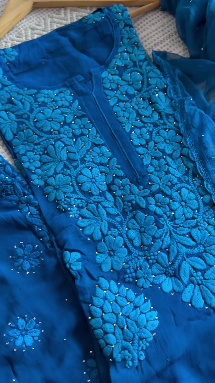 Royal Blue Hand-Embroidered Chikankari Suit with Intricate Floral Detailing