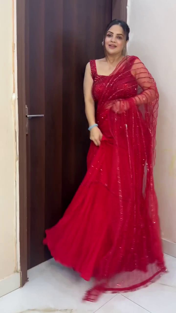 Scarlet Red Sequined Net Saree with Designer Blouse
