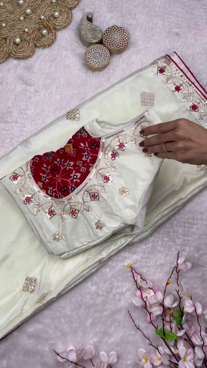 • Patola-Print Bodice Fusion: The blouse features a striking contrast panel of deep red Patola-style geometric print on the front, creating a bold traditional focal point.
