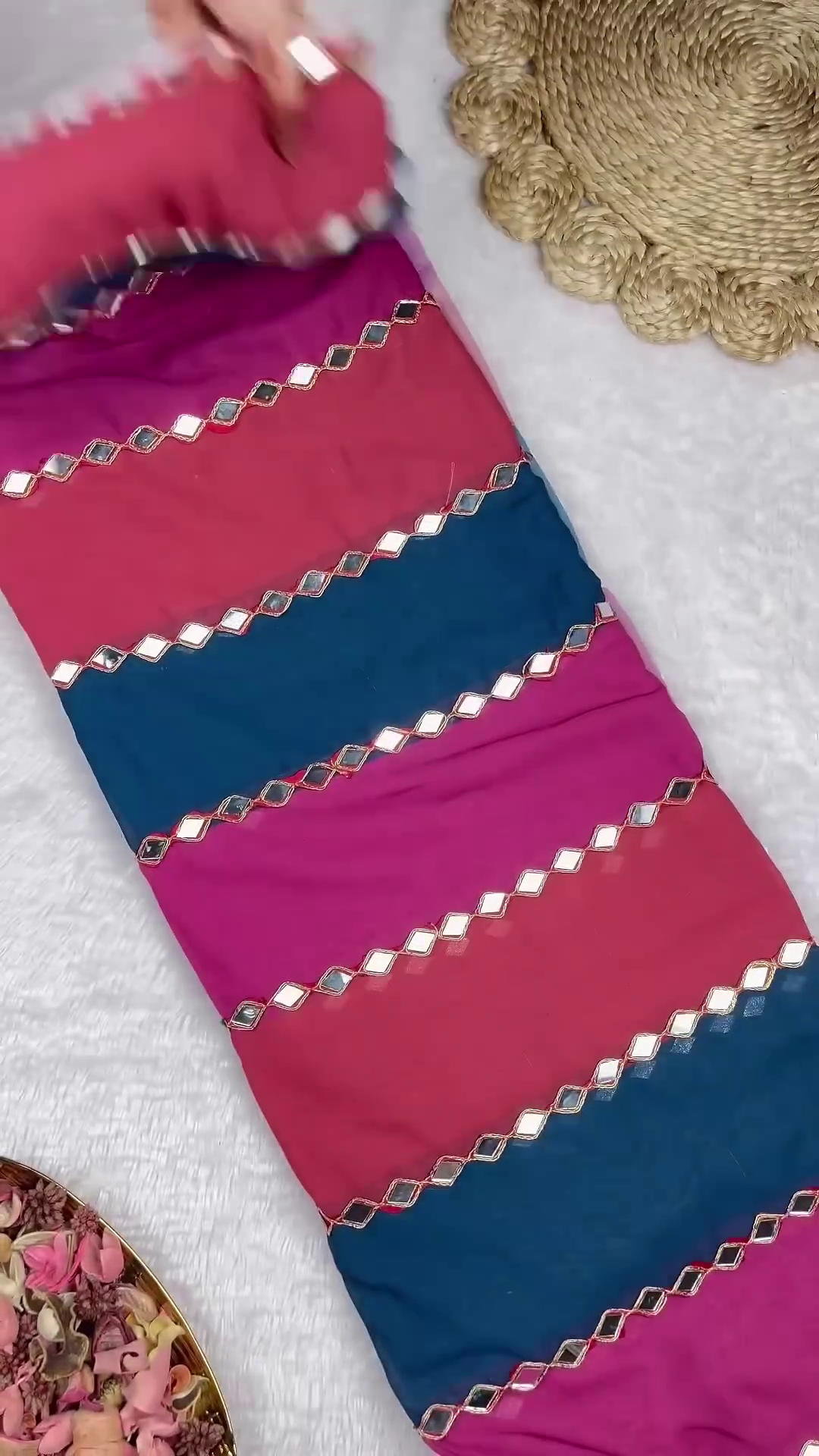Complete the look with a sleek low bun to prominently showcase the unique mirror-work neckline and back dori detail.